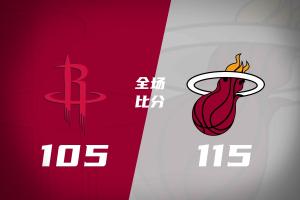 比赛开始,谢泼德连中三分带队打出14-4的开局,申京攻防两端被针对,热火连中3记三分强势反超,后半段火箭进攻停滞,热火趁机轰出19-2的进攻高潮取得两位数领先,杜兰特和谢泼德联手带队抹平分差,半场战罢火箭52-51领先热火。易边再战,热火占得先机,内外开花再度占据场上主动,杜兰特得分助攻一肩挑带队咬住,末节热火持续发力,维金斯反击暴扣打2+1,帮助球队将分差拉开到两位数,火箭大势已去无力回天。最终,火箭105-115不敌热火,客场落败。